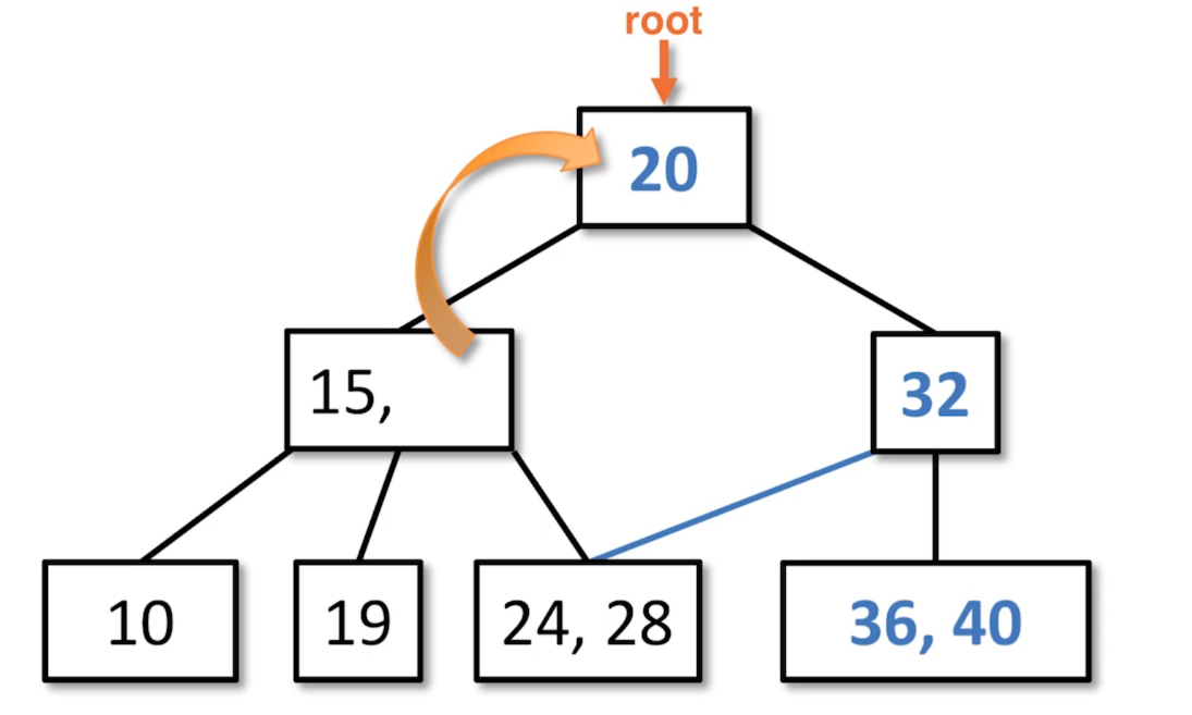 The root is underflowed, so we steal from one of the children, because the left child has two values. 20 is the closest value.