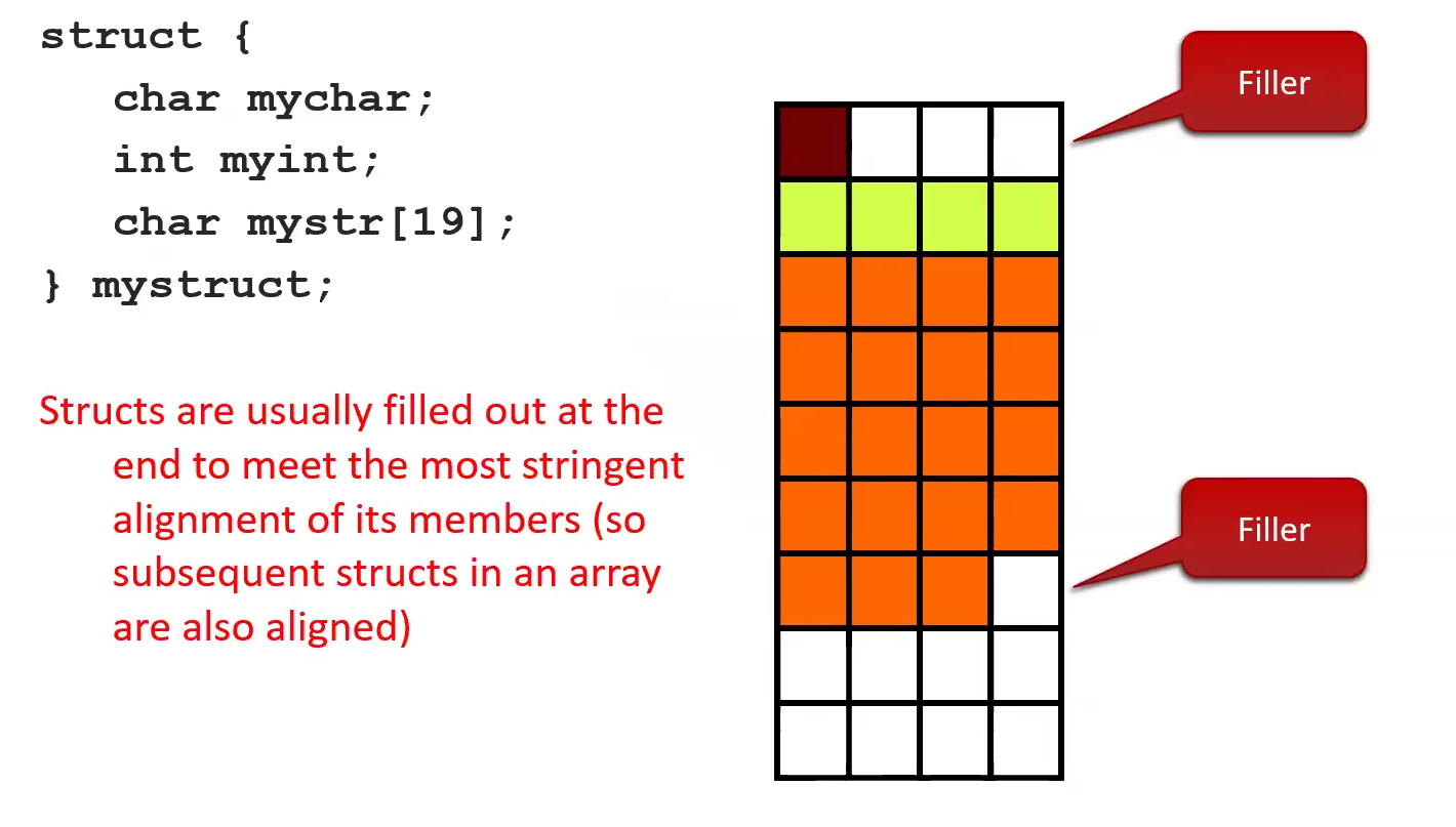 intwhich is 4 bytes. This is because: imagine what happens if we need to make an array of this struct. - The size of this struct is 4 x 7 Note: Compiler maintains a list of the members, their types, and an offset from the beginning of the struct