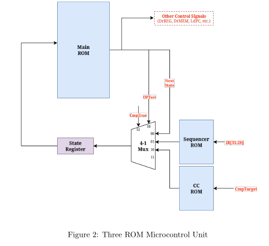 Maps CmpTarget to address in Main Rom When doing a conditional branch, CC ROM’s current selected address or the next state bits will be used. The CC ROM contains addresses of the beginning of different microstates needed for branching. It would probably look something like this