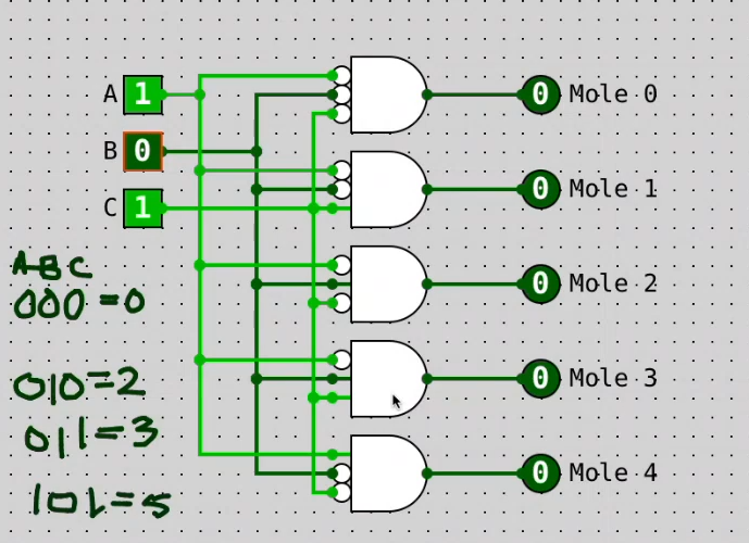 Map binary to nth output Each 3 input AND only accepts one binary number. It is “hardcoded”.