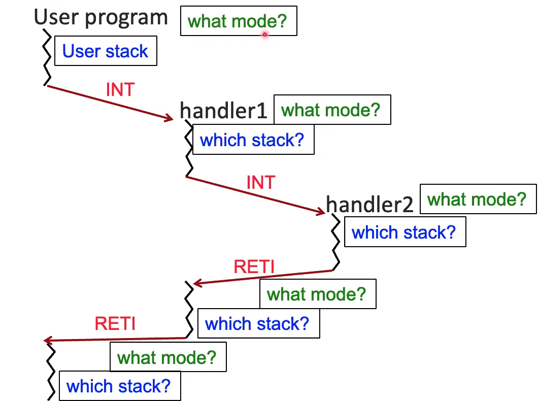 - We also have to keep track of user/kernel mode. Only kernel mode can run RETI or touch the kernel stack.