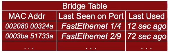 - Put the source MAC in the bridge table, if neccessary, along with the frame ingress port and mark the entry “recently used”