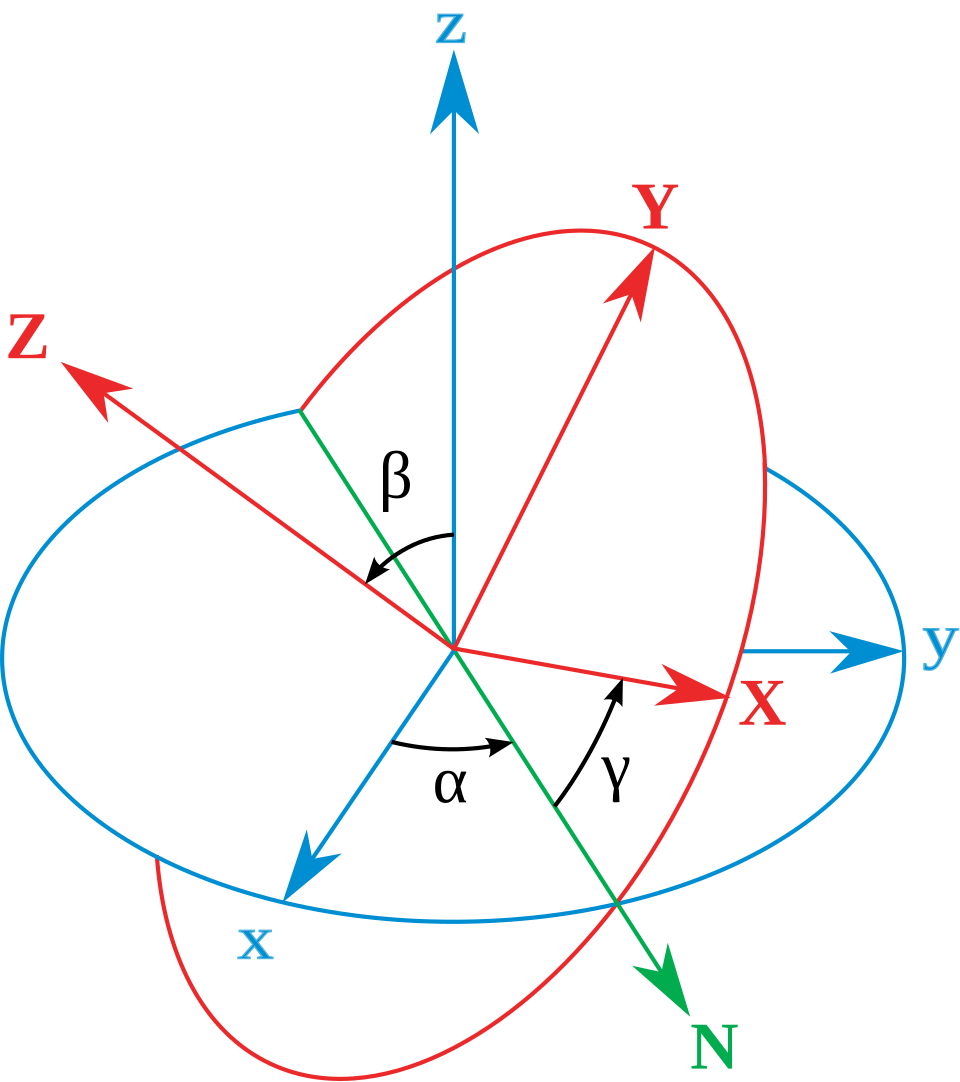 A way of representing the orientation of a body in 3d space, using 3 angles. Each angle is rotation about one of the coordinate axes. The orientation is equivalent to performing each rotation in succession. The order absolutely matters.