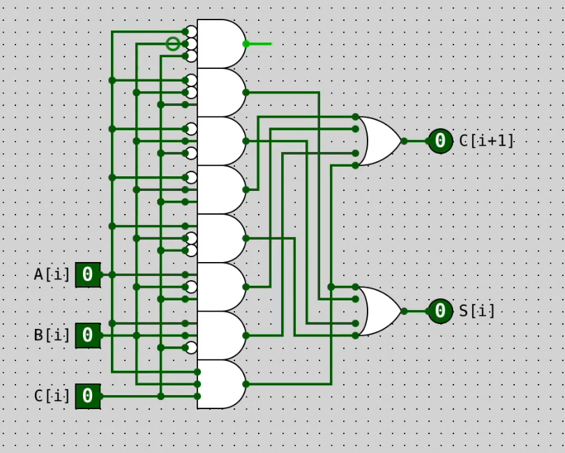 Start with truth table for different combinations of bits Derive circuit from this; if you want a given result to be 1, just NOT all the negatives and AND