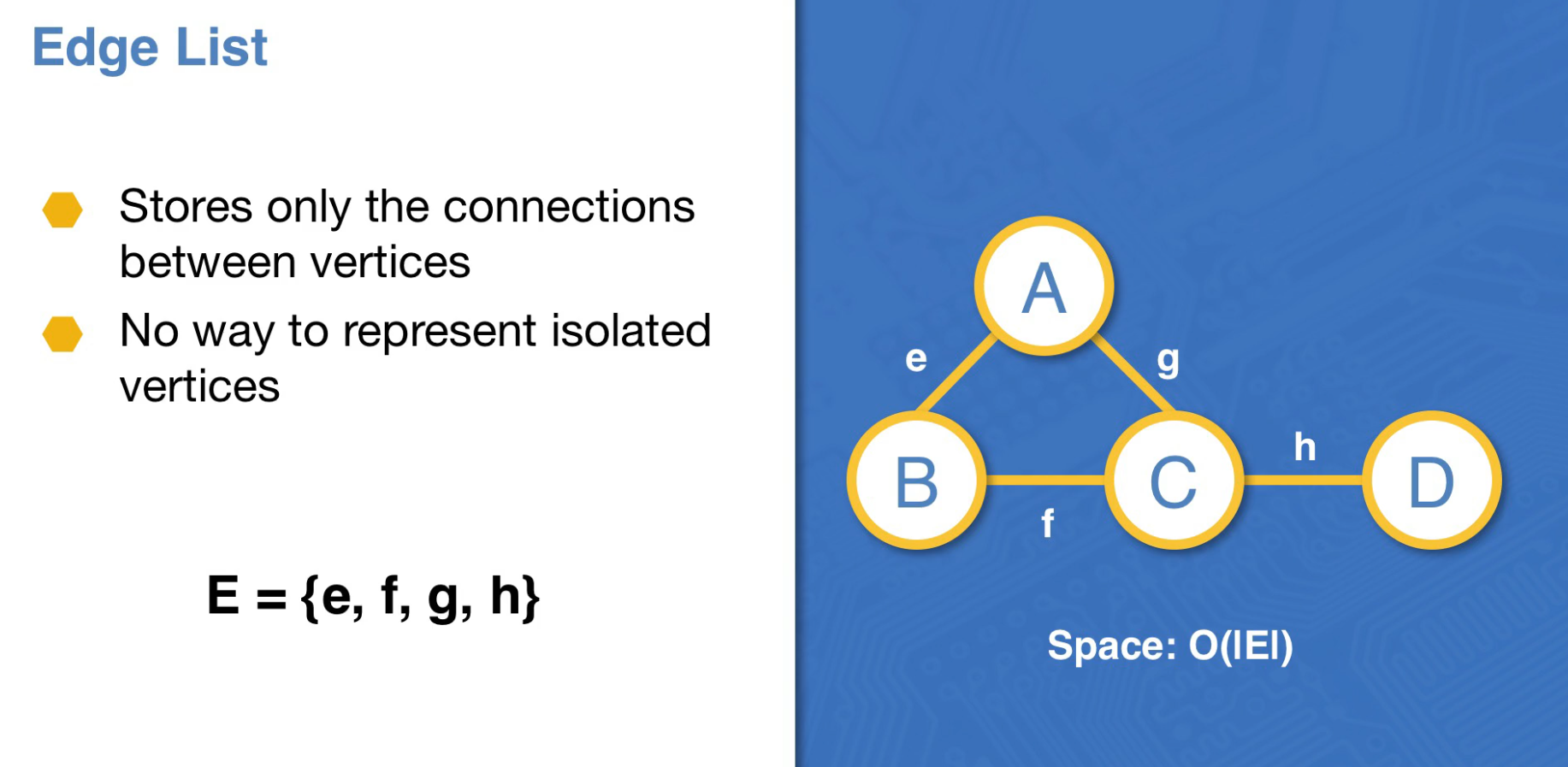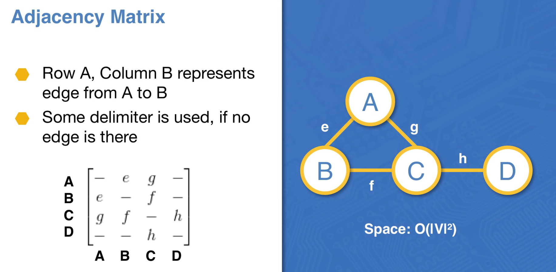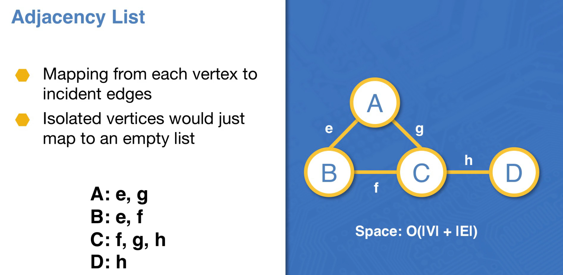 vertices()returns iteration of all verticesedges()returns iteration of all edgesnumVertices()returns count of all verticesnumEdges()returns count of all edgesendVertices(e: Edge)returns endpoint vertices of given edgegetEdge(u: Vertex, v: Vertex)returns edge from u to v or else nullnumEdges(v: Vertex)returns iteration of all outgoing edges to vopposite(v: Vertex, e: Edge)returns the other vertexx u that is incident to v for edge einsertVertex(d: Value)create a return new vertex with value dinsertEdge(u: Vertex, v: Vertex, e: Edge)create a return new Edge e from vertex u to vremoveVertex(v: Vertex)removes vertex v and all incident edges for v from the graphremoveEdge(e: Edge)removes edge e from the graph
