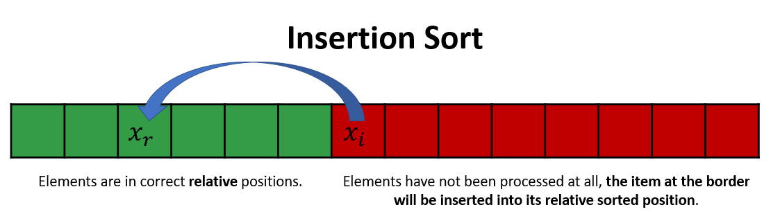 Assume the elements before the current index are sorted. Insert the next element in the remaining dataset into the correct place in the sorted data.