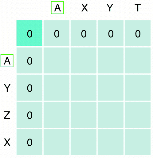 - Note index 0 for the columns and rows is the empty string, and the subsequence of any string with "" is 0. This means that all of row 0 and all of column 0 are 0s