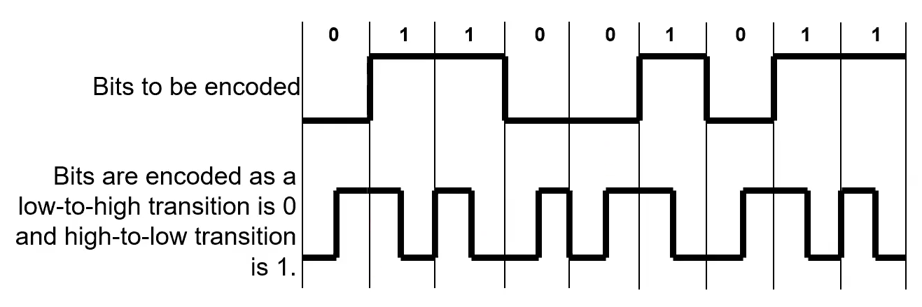 - The clock pulses twice for every bit to be encoded, at the beginning of the window, and in the middle of the time window for that bit.