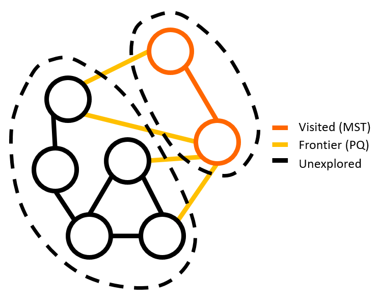 This visited set implicitly creates a graph cut between visited vertices and unvisited vertices. The edges in the priority queue (the “frontier” is what we called it in Dijkstra’s) are precisely the edges in this graph cut, and the priority queue will of course give us the minimum cost edge.
