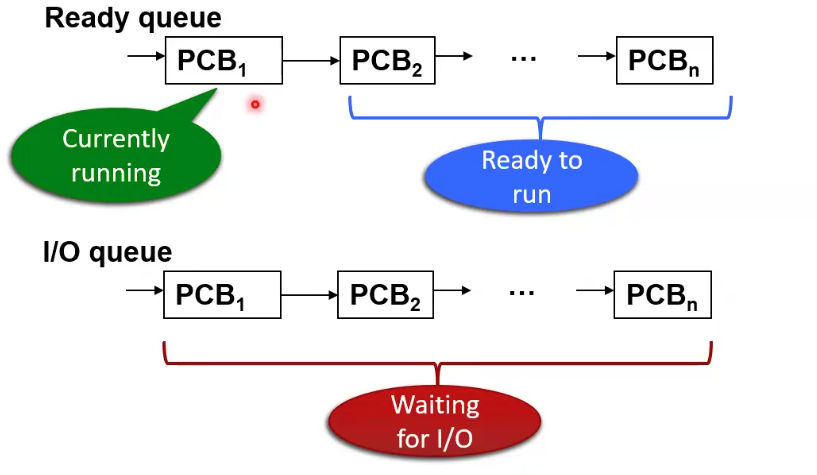 Each process gets its own representation as a Process Control Block in the Ready Queue or O Queue