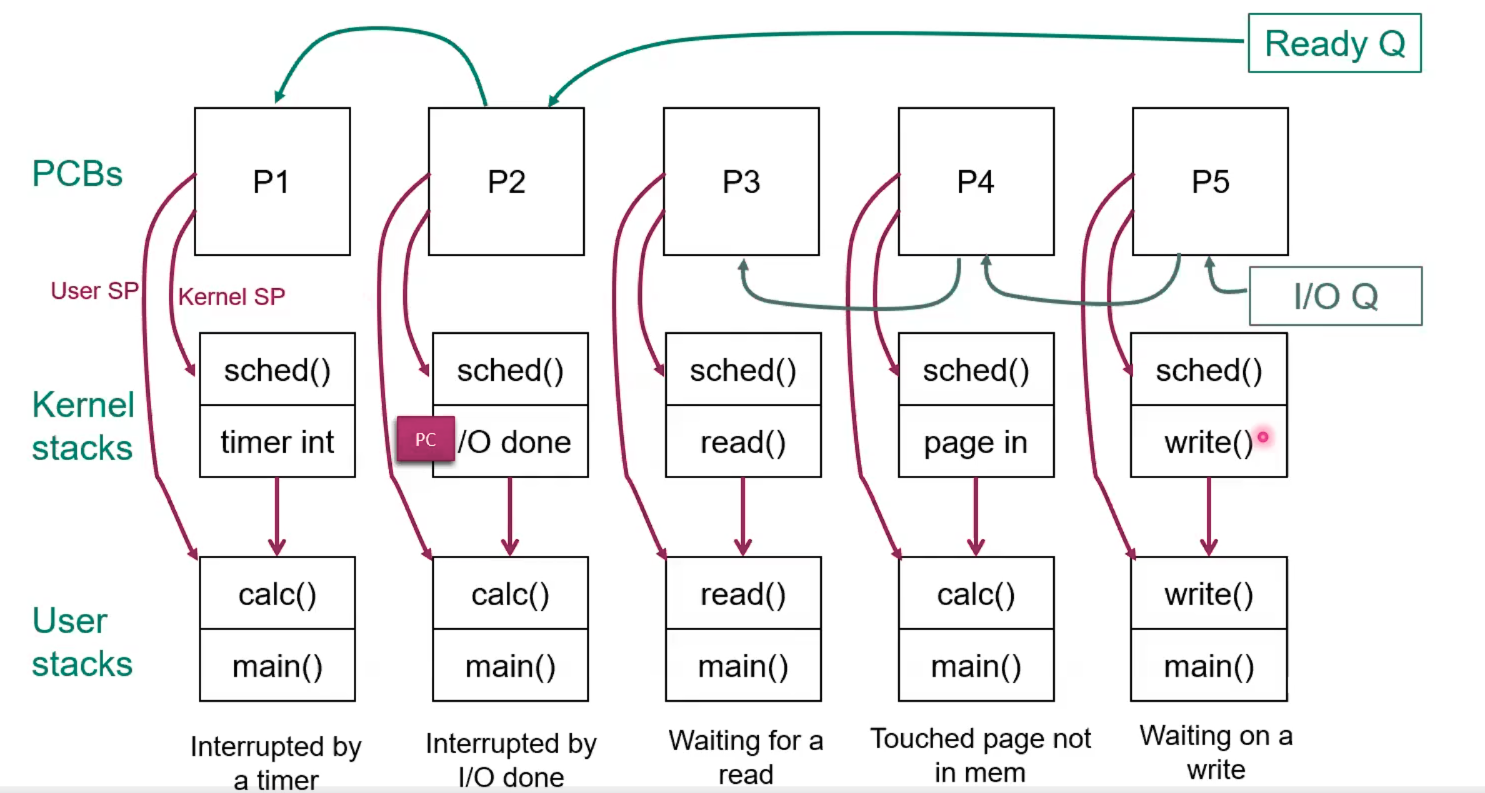 - When our PCB reaches the head of the Ready Queue and is Dispatched, the scheduler will return and using the new process’ state which means that sched() will “return” to the first instruction of the program