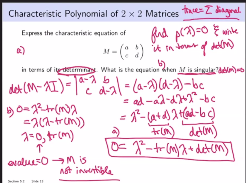 to get values for . Recall means noninvertible. If a matrix isn’t invertible, then we won’t get trivial solutions when solving. Also the idea of reducing the dimension through the transformation is relevant; squishing the basis vectors all onto the same span where the area/volume is 0. Recall eigenvectors remain on the same span despite a linear transformation.