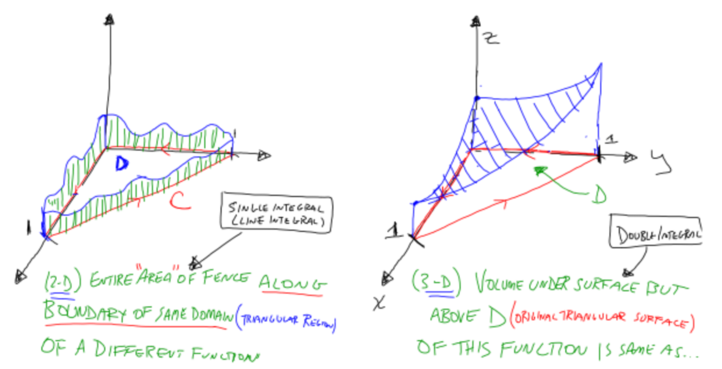 Green’s Theorem equates An area of a fence (Line Integral) A volume under a surface (Double Integral) Let must be positively-oriented, meaning that is on the left hand side when walking the curve. This is simply just because if it were negative oriented, the sign of the Line Integral would flip.