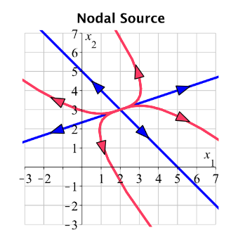 Both eigenvalues are postitive, so the eigenspace arrows all go out. Because they have the same sign, the curves off of the eigenspaces are parabolas. (e) The equilibrium is unstable.