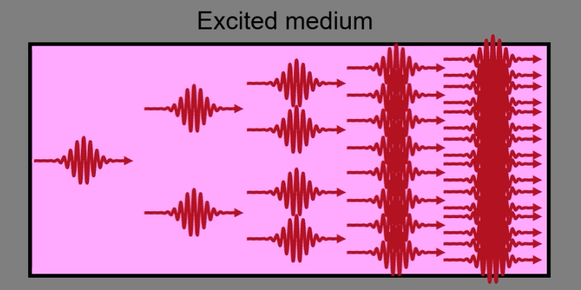 - If a medium has many excited molecules, one photon can be become many. This is the essence of a Laser
